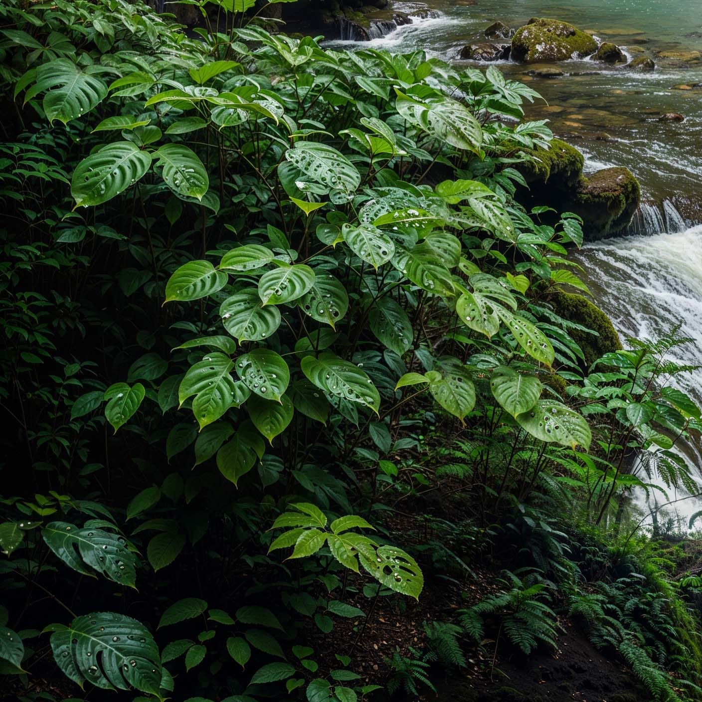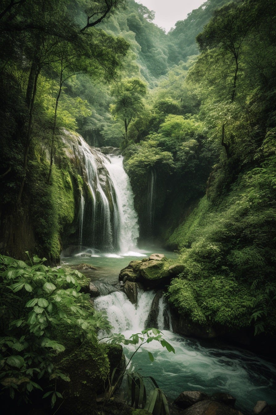 "photography, a green lush waterfall in the middle of the jungle, (realistic water, waterfall, water drops:1.3), (realistic plants and tress:1.3), rain forest, (realistic ferns:1.2)"
